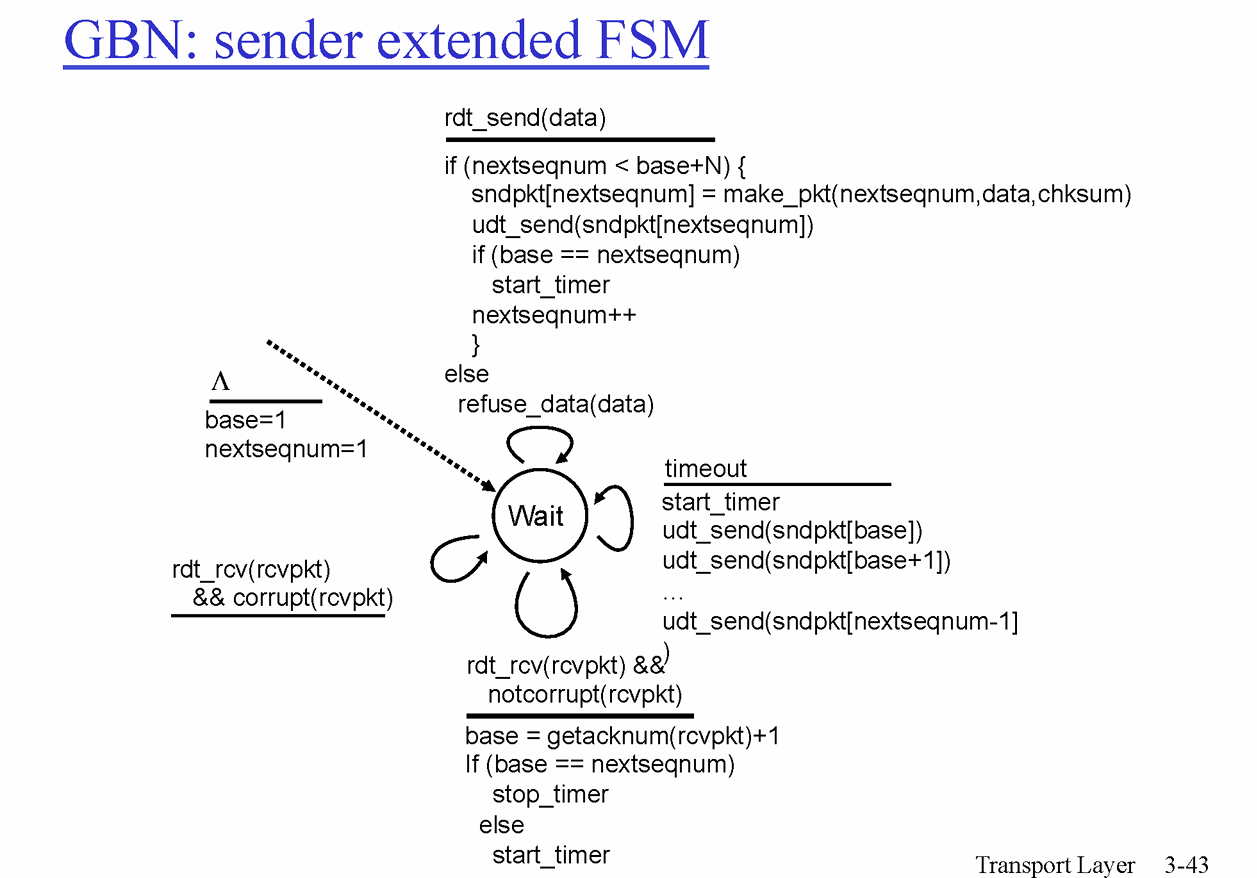 - ex) window size = 4, [0, 1, 2, 3] 전송할 때 timer 0 이 터졌으면 0이상의 모든 패킷들 다 재전송