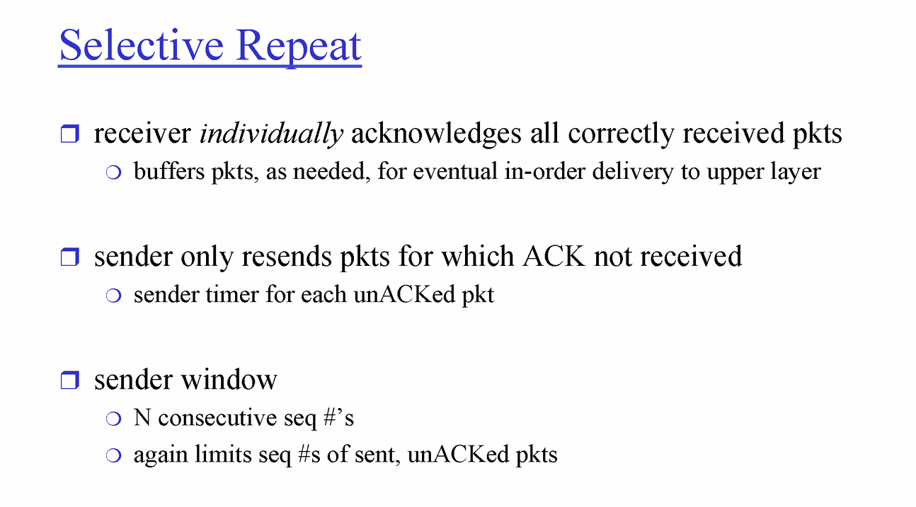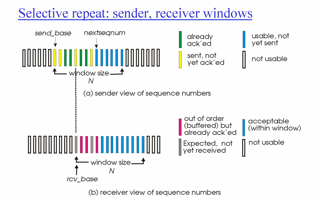 - window안에 있는 패킷들은 버퍼에 저장하고 있어야 한다. 아직 재전송 확률이 있기 때문에 버퍼에 담고있어야한다는 의미. 하나 잘못 보냈다고 다시 여러개를 재전송한다는 것은 매우 비효율적이다.