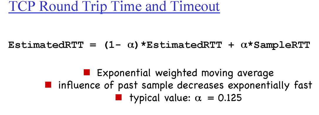 우리가 측정한 SampleRTT값을 사용하면 너무 편차가 크기 때문에 여기 가중치 $α$ 를 곱해 보정해서 사용한다.