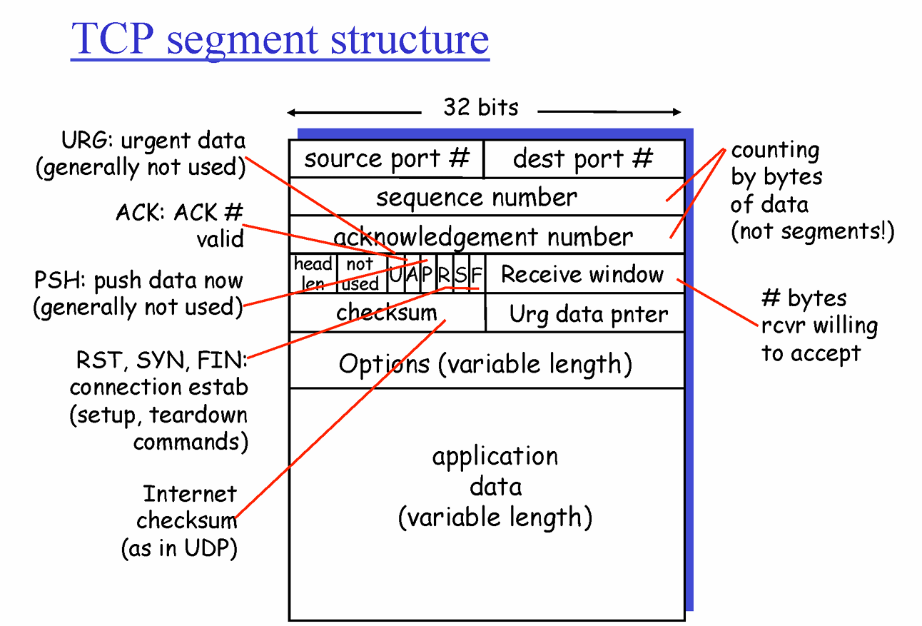 - TCP에서 사용하는 Sequence Number은 Data를 Window Size만큼 잘라보낼때 제일 앞에 있는 데이터 Byte 번호다. ex) 100Byte짜리 메시지를 10Byte짜리 Segment씩 보낸다고 가정해보자. 그럼 [ 0~9 ], [ 10~19 ], . . . 이런식으로 나뉘어 질 것이다. 그러면 첫번째 [ 0~9 ] 의 Sequence # 는 이 중 맨 앞인 0번이 된다. 다음 세그먼트의 Seqence # 는 10번이 된다. TCP는 이런식으로 번호가 매겨지게된다.