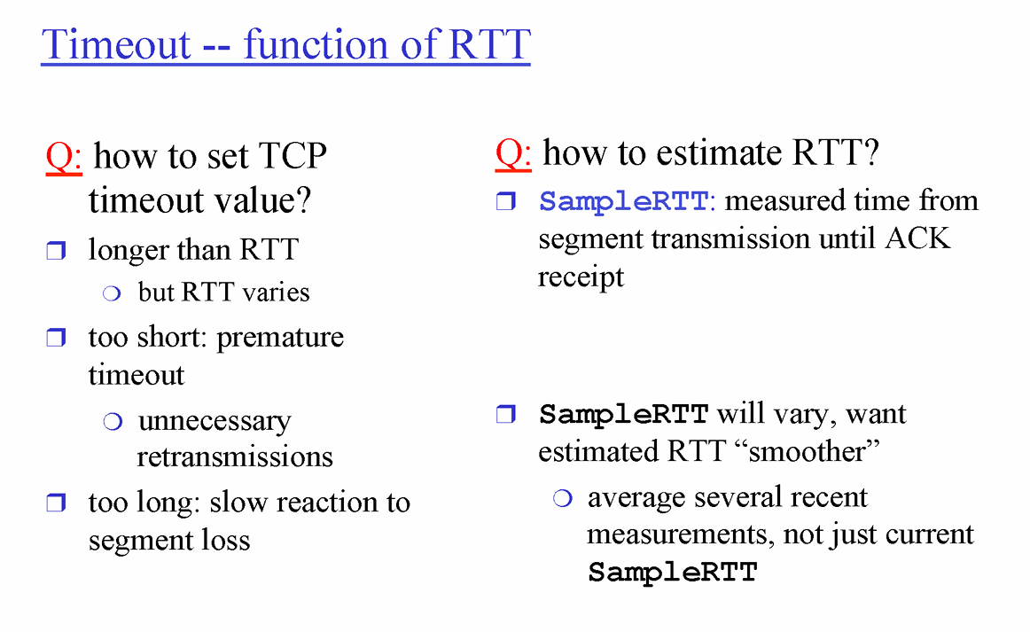 - RTT값이 각 세그먼트마다 다르다. 각각 지나는 경로가 다르면 RTT값이 다르고, 같은 라우터를 지나는 패킷 경로라 하더라도 Queueing Delay에 따라 값이 바뀔 수 있다.