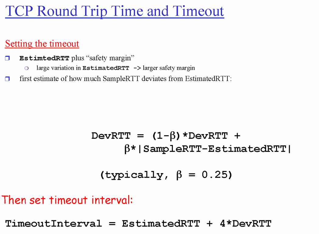 아래 식에서 볼 수 있듯 Estimated RTT 에 4 * DevRTT라는 마진을 붙여 보정해서 사용한다.