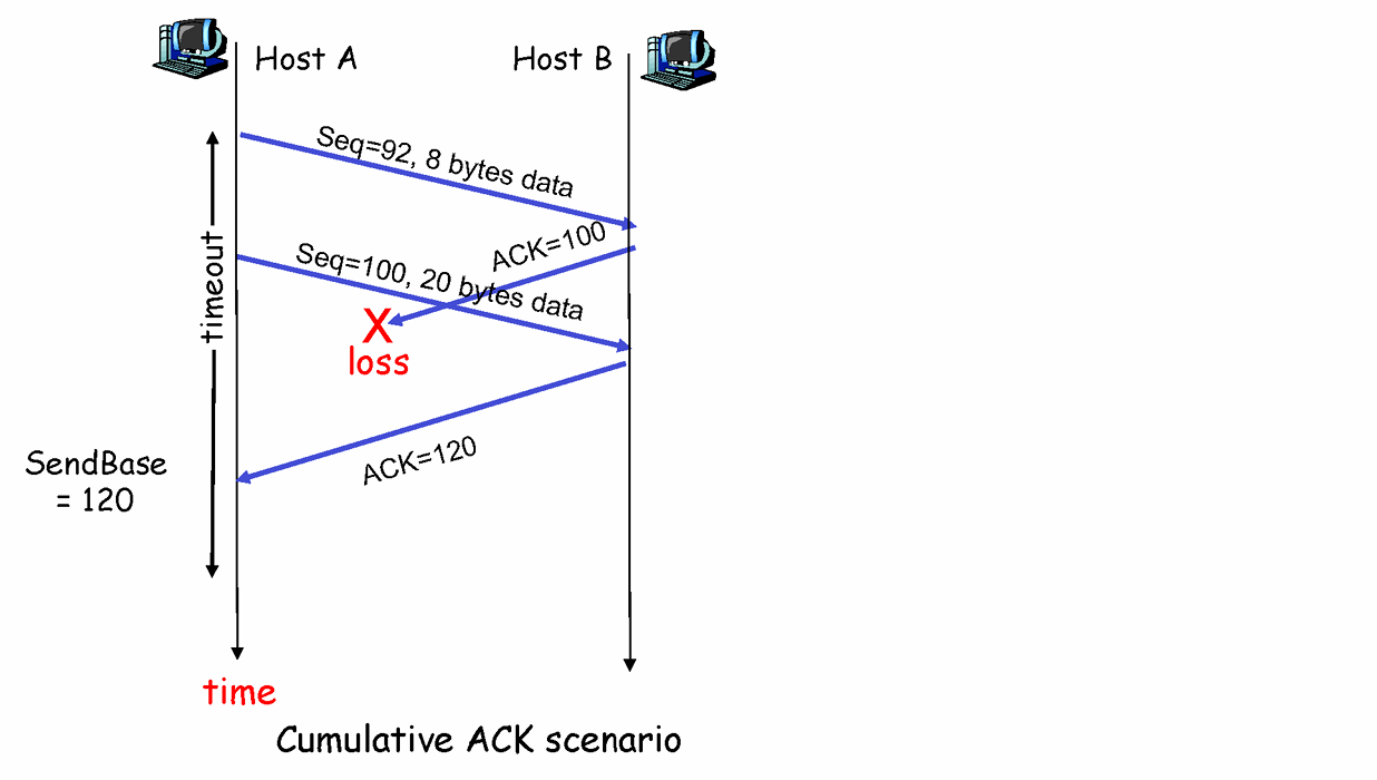 - 여기서 재전송한 ACK를 받은 A는 Sequence# 92를 재전송한 상황이기에 ( Sequence# 92에 해당하는 Timeout만 터짐. 타이머 하나임 ) ACK 120을 보고 이 타임아웃은 해결되었음을 알게됨( ACK 100아니므로 ). 타임아웃을 초기화하여 종료함.