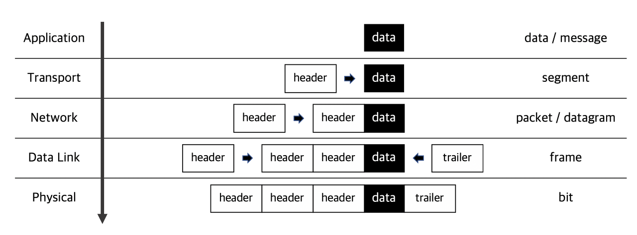 Transport (TCP) 계층 전송단위는 Segment, Header에 메타데이터, Data에 application계층의 Data 들어감. 전송하는 입장에선 Header(메타데이터) 만 보고 전송하면 된다. 내부 데이터는 보지않는다. 예를들어 우편배달부가 편지를 전송할 때 편지봉투에 적힌 이름, 주소정보(메타데이터) 들을 보고 전달하지 편지봉투를 열어 편지 내용을 보고 전달하지 않는 것과 같다.