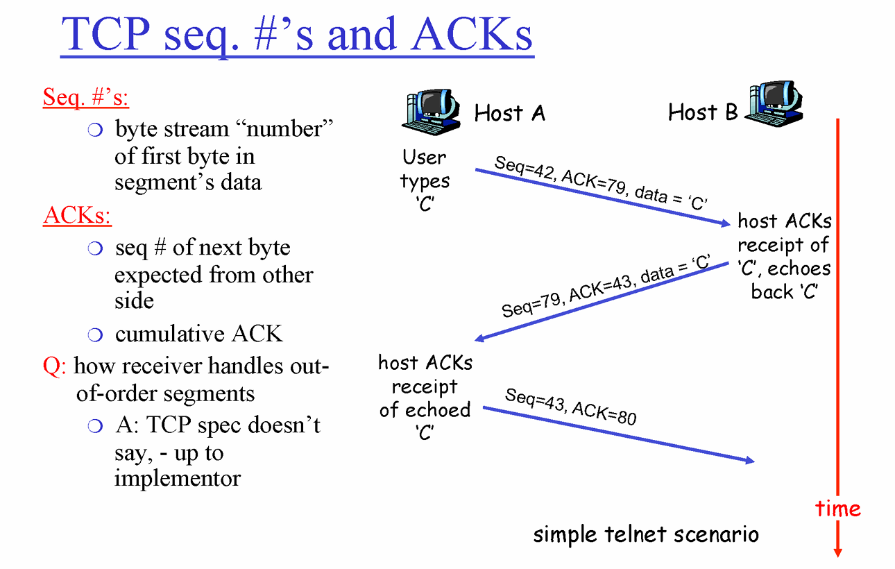 - TCP에서 ACK는 이전 Go-Back-N의 ACK와 헷갈리게도 좀 다르다. 이전에 GBN에서는 ACK 10은 “10번까지 잘 받았다” 라는 의미였다. 하지만 TCP에서는 ACK 10의 의미는 “9까지 잘 받았고 다음 10번을 받을 차례다” 라는 의미다. 그래서 그림에서 호스트 A에 보이는 Seq # = 42, ACK = 79라는 의미는 Send Buffer이 있는 C의 Byte번호가 42라는 뜻이고, Receive Buffer에 78번까지 잘 받았으니 79을 받아야한다는 뜻이다.