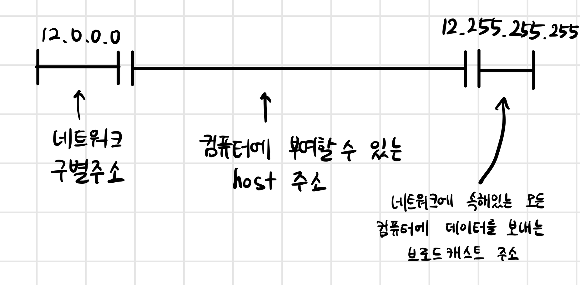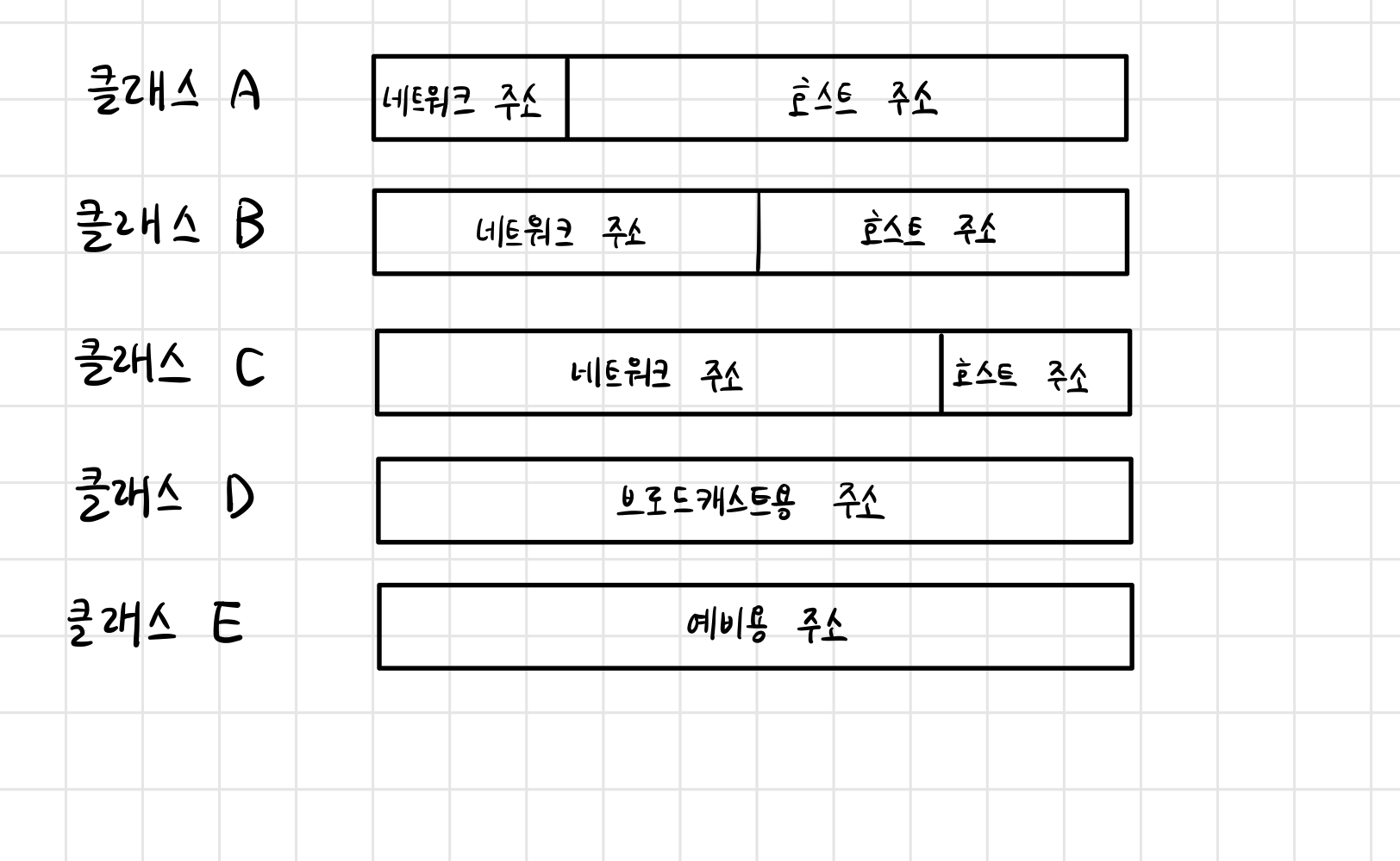 클래스 A, B, C 는 일대일 통신으로 사용됨. 클래스 D는 멀티캐스트 통신, 클래스 E는 앞으로 사용할 예비용.