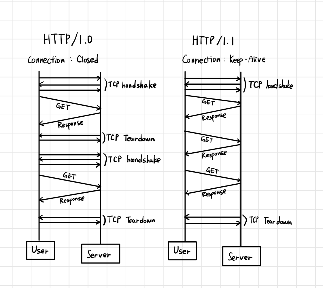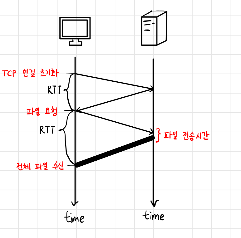 - 서버로부터 파일을 가져올 때마다 TCP의 3-way-handshake를 계속 열어야해서 RTT가 증가하는 단점이 있음