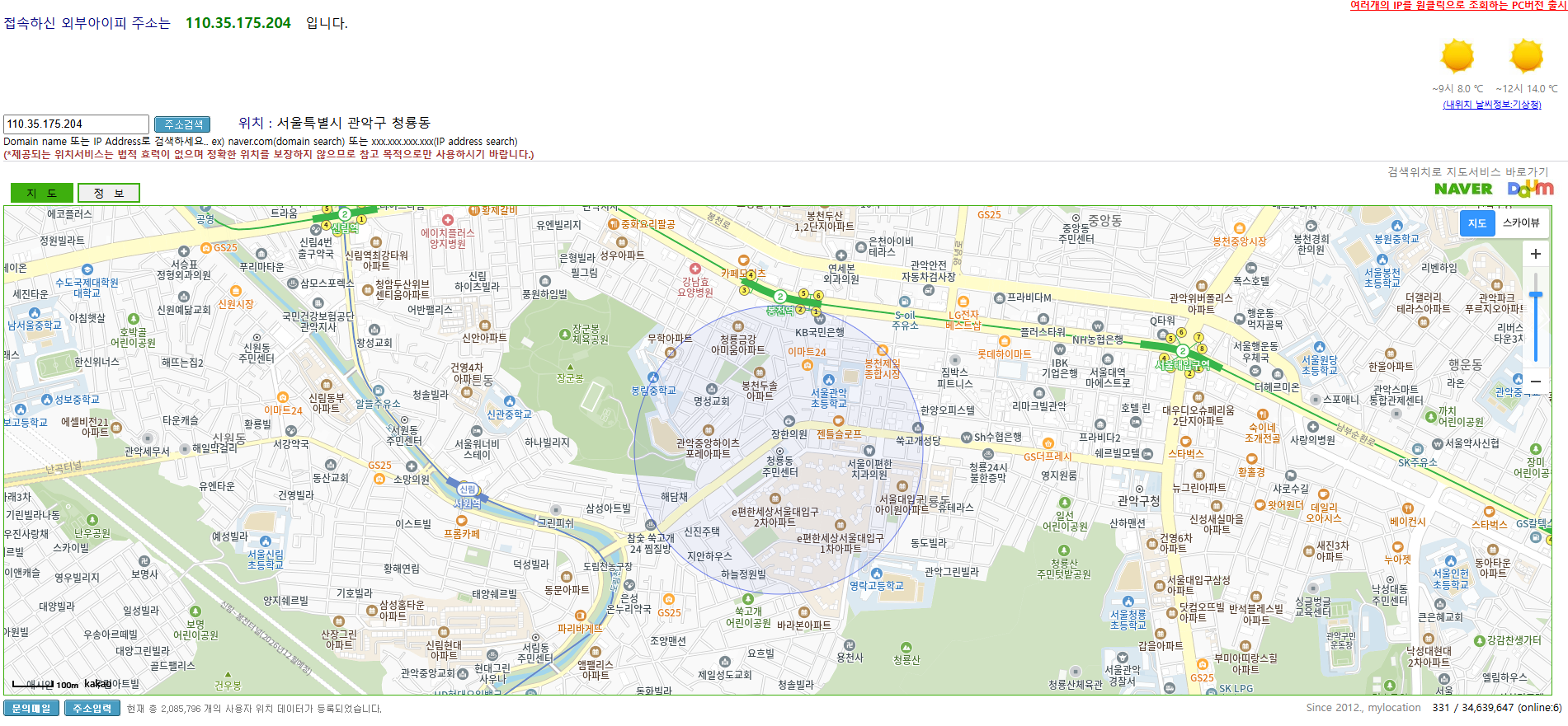 서울대입구역 근처에 거주중인데 나름 IP만으로 비슷하게 찾은것을 볼 수 있다. 한 정거장 정도 차이가 난다.