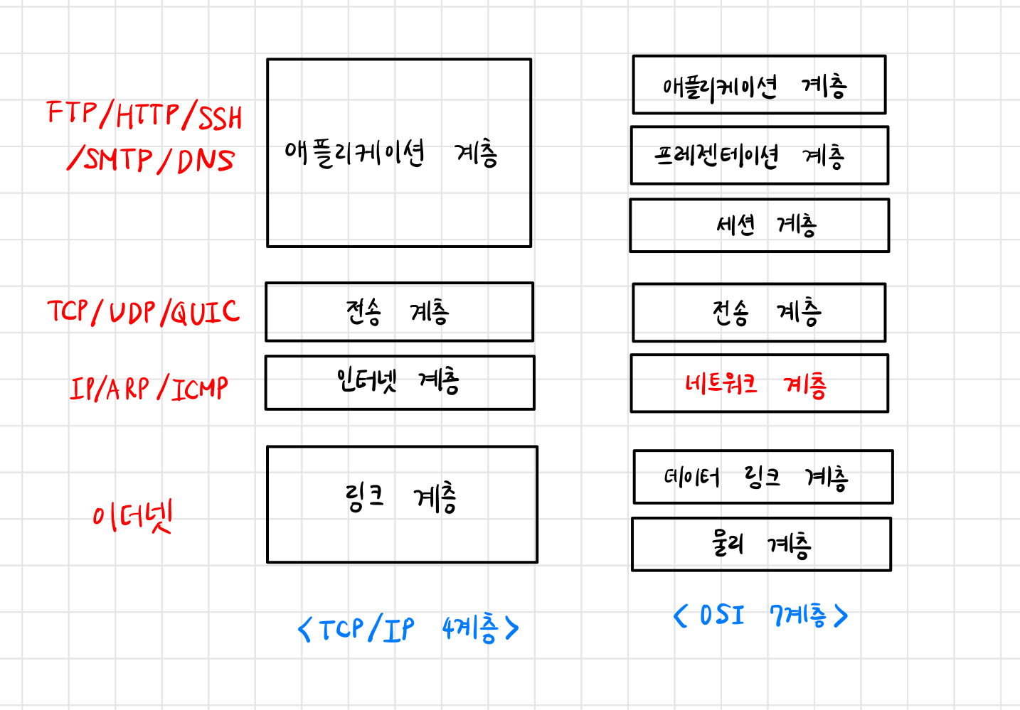 TCP/IP 4계층과 OSI 7계층 비교 및 대표 스택 (빨간색)