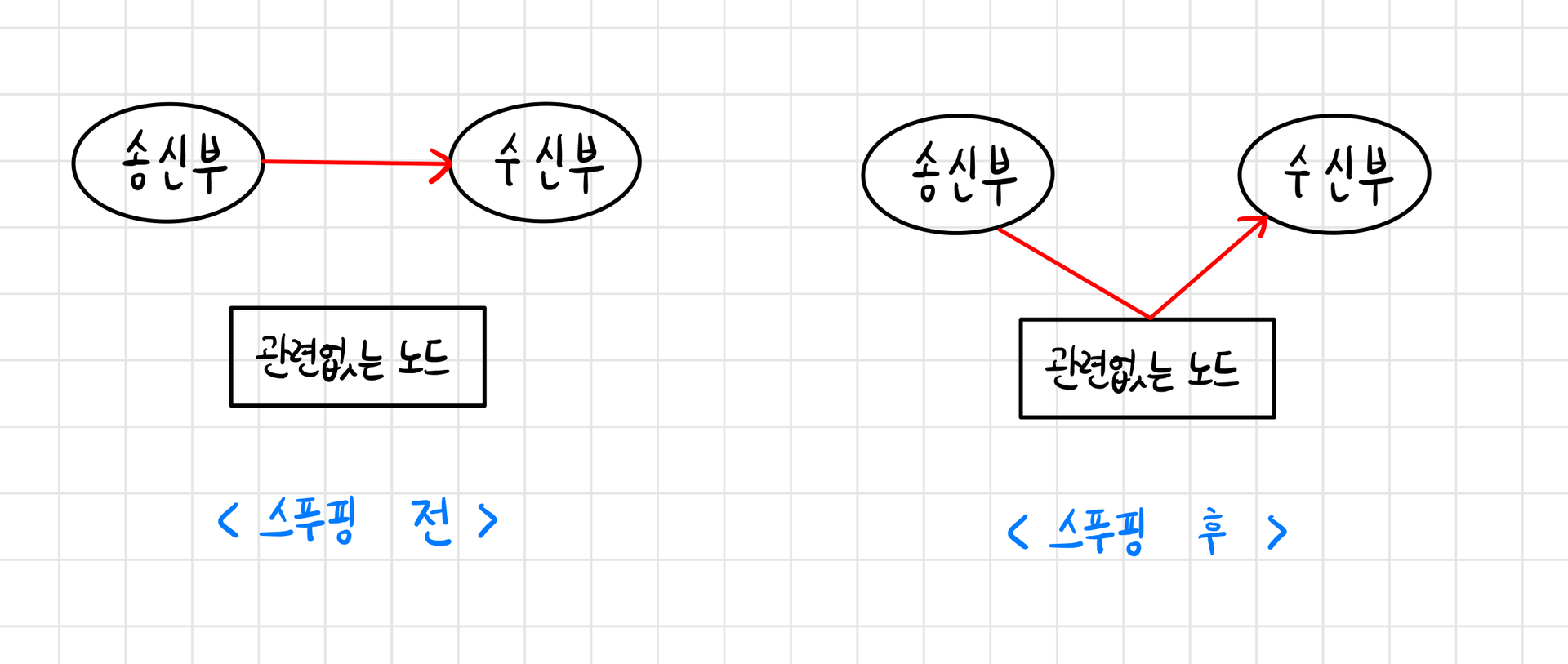 스푸핑을 적용하면 올바른 수신부로 가야할 패킷이 악의적인 노드에 전달됨. - 스타 토폴로지