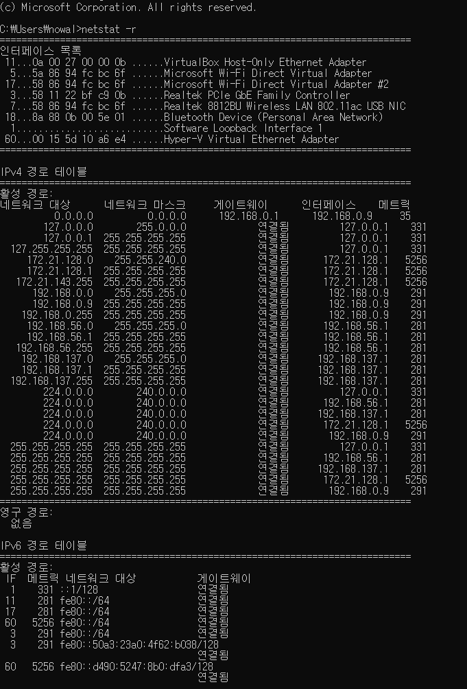 - 네트워크 접속, 라우팅 테이블, 네트워크 프로토콜 등 리스트 보여줌