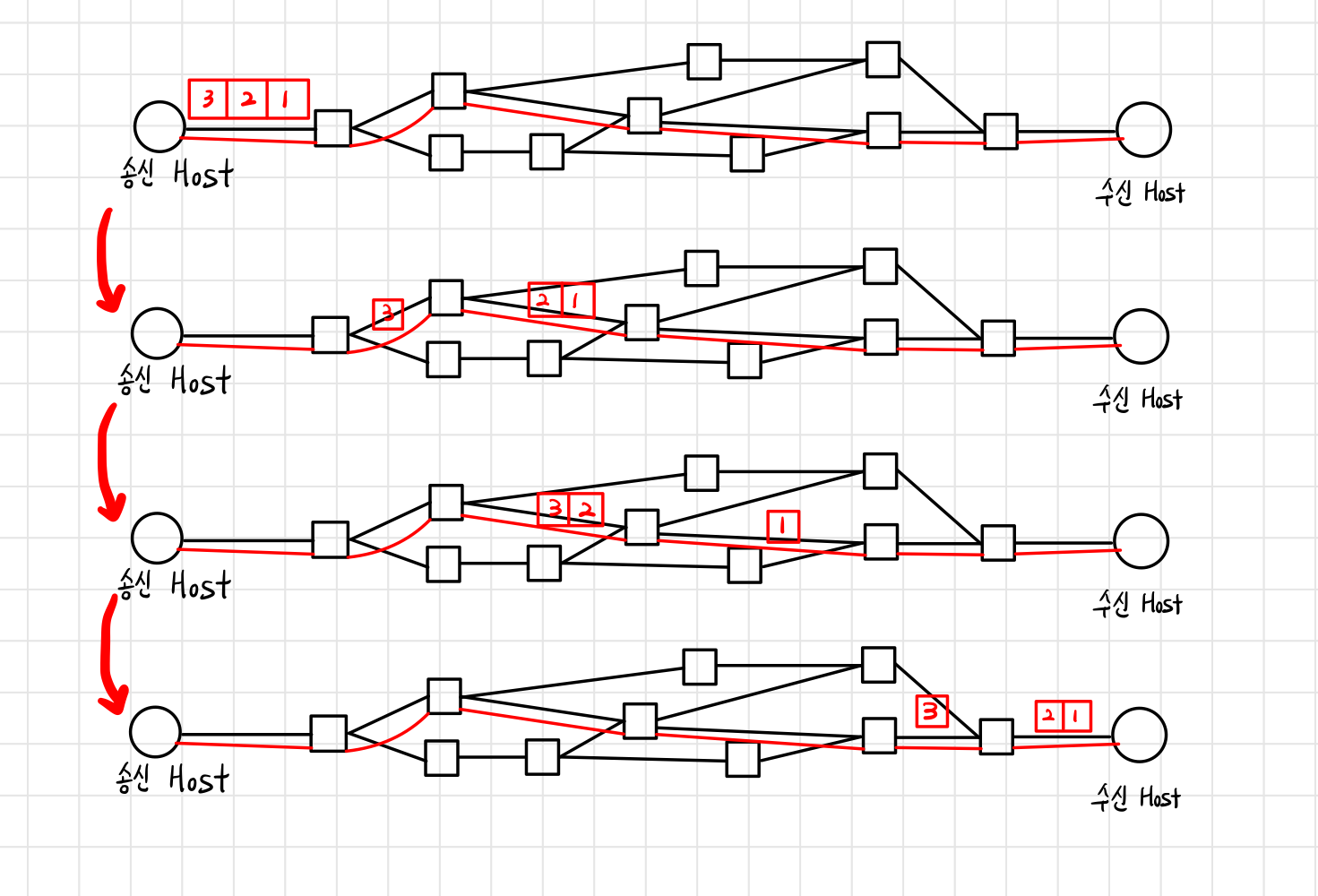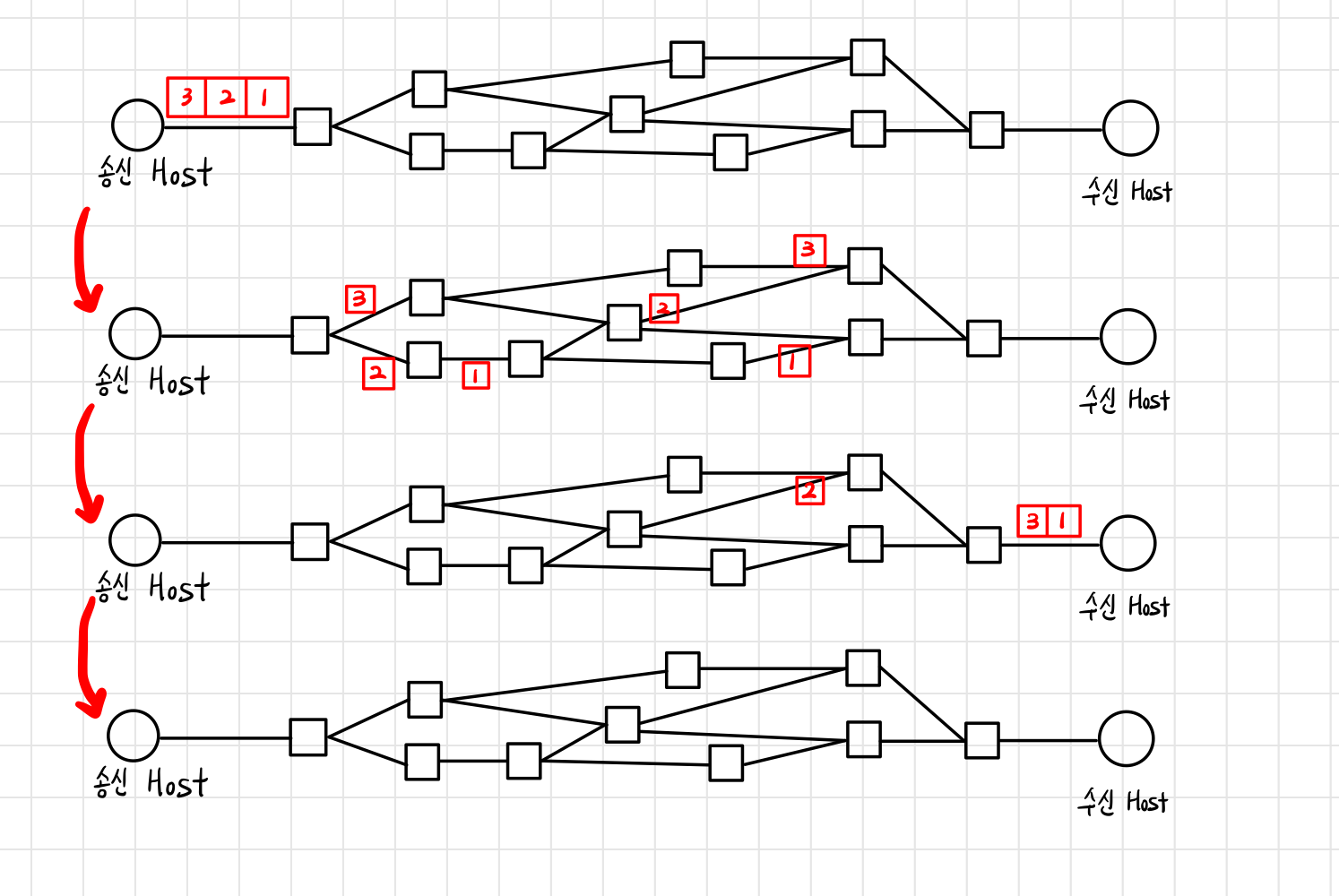 - IP 주소를 통해 통신하는 과정, 통신망에서 각 패킷이 여러개의 라우터를 건너가는 모습을 표현함