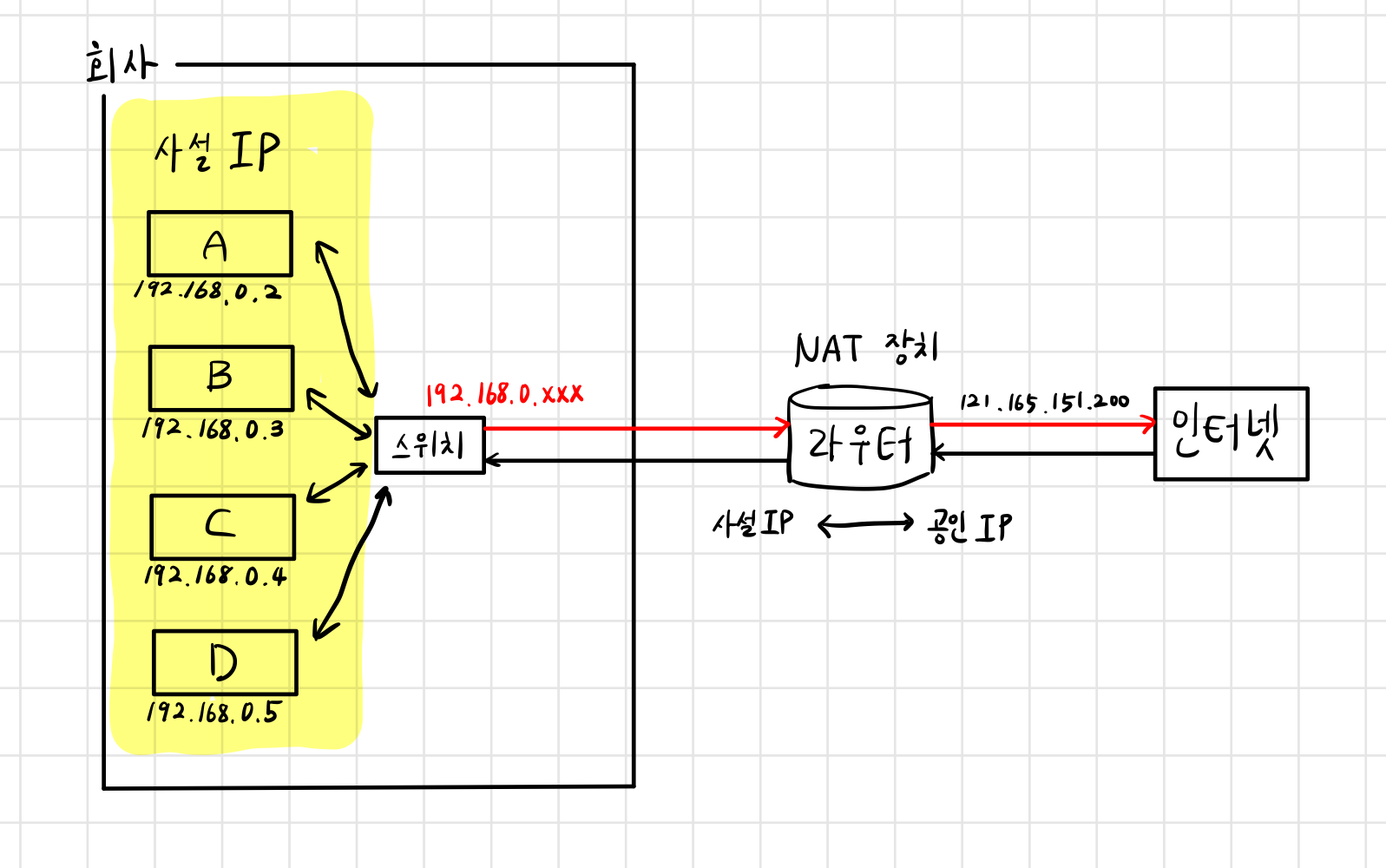 사설IP를 NAT장치를 통해 공인 IP로 외부 인터넷에 요청할 수 있다. 이를 통해 A, B, C, D 는 1개의 공인 IP를 기반으로 각각 다른 IP를 가지는것처럼 사용 가능.