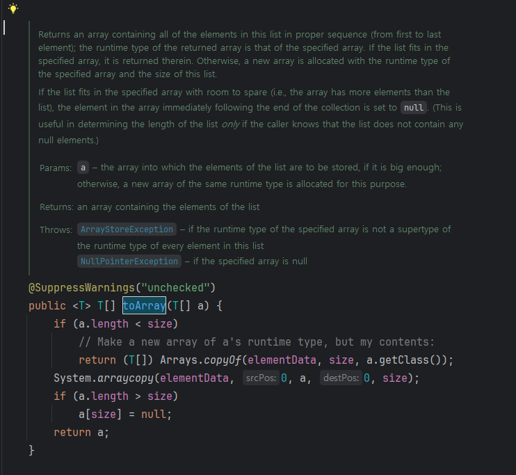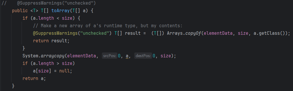 T[] result = (T[]) Arrays.copyOf(elementData, size, a.getClass());