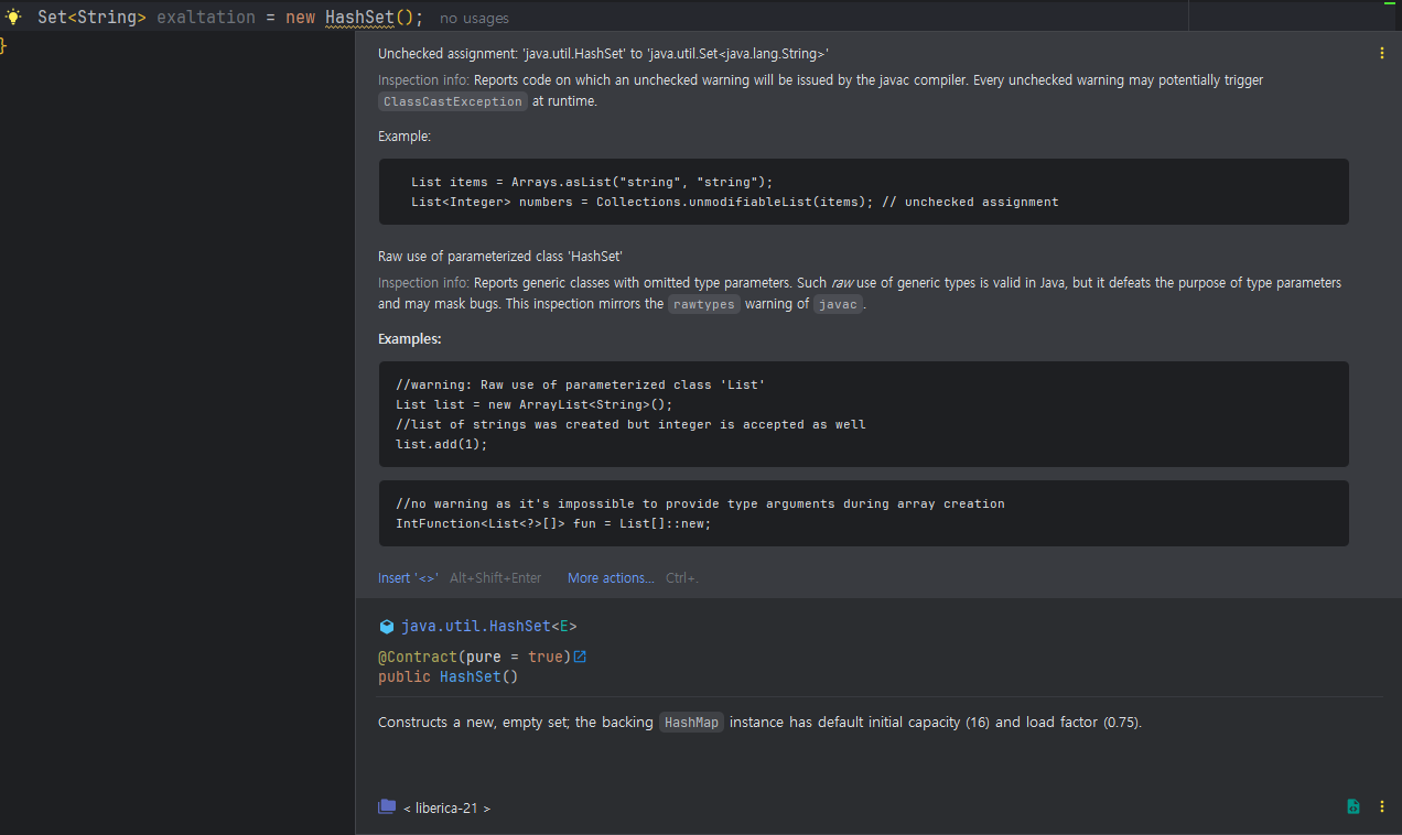 이 경고는 HashSet()이 로타입이므로 Set<String>에 할당할 때 타입 안전성을 보장할 수 없다고 알려준다.