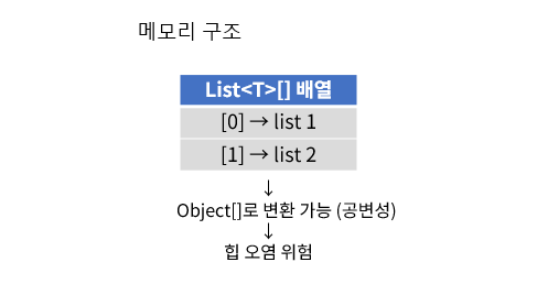 List<List<T>>객체 → 배열이 아니므로 공변성 문제 없음 → 안전