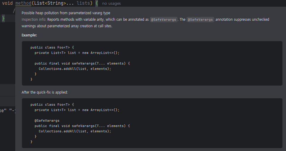 문제는 여기서 발생한다. 실체화 불가 타입으로 varargs 매개변수를 선언하면, 즉 제네릭 타입의 가변인수를 사용하면 배열을 생성하는데, 제네릭 배열 생성은 본래 불가능해야 한다.