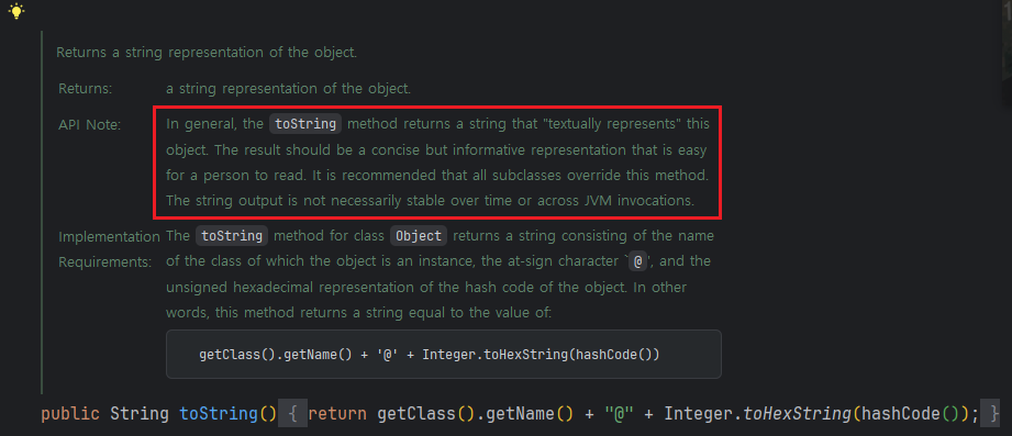 Object.toString()의 Javadoc을 보면 다음과 같은 규약이 명시되어 있다.