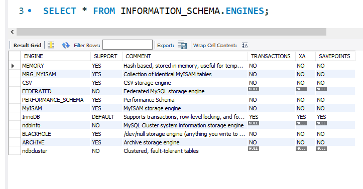 SELECT * FROM INFORMATION_SCHEMA.ENGINES;