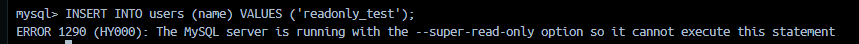 mysql> INSERT INTO users (name) VALUES ('readonly_test');