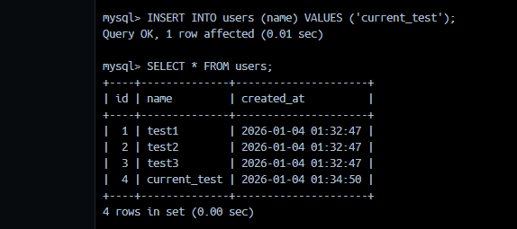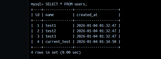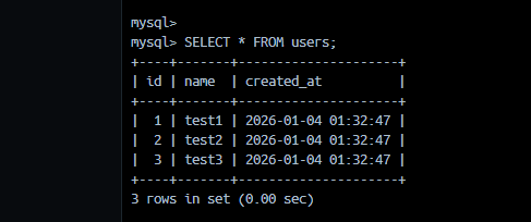 | 1 | test1 | 2026-01-04 00:41:37 |