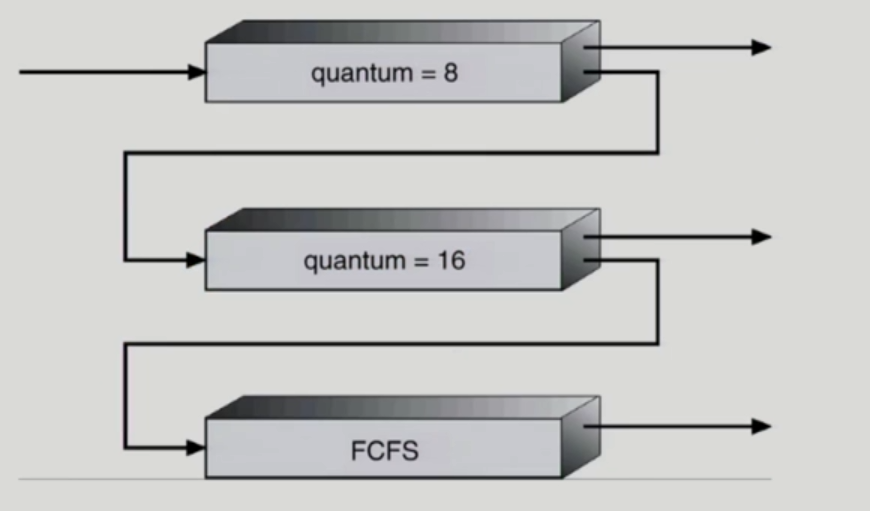 - 처음 들어오는 프로세스는 가장 높은 우선순위를 가지는 queue에 보냄. (quantum이 가장 짧음)