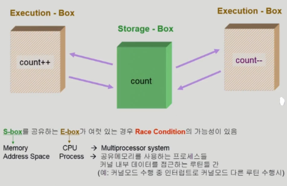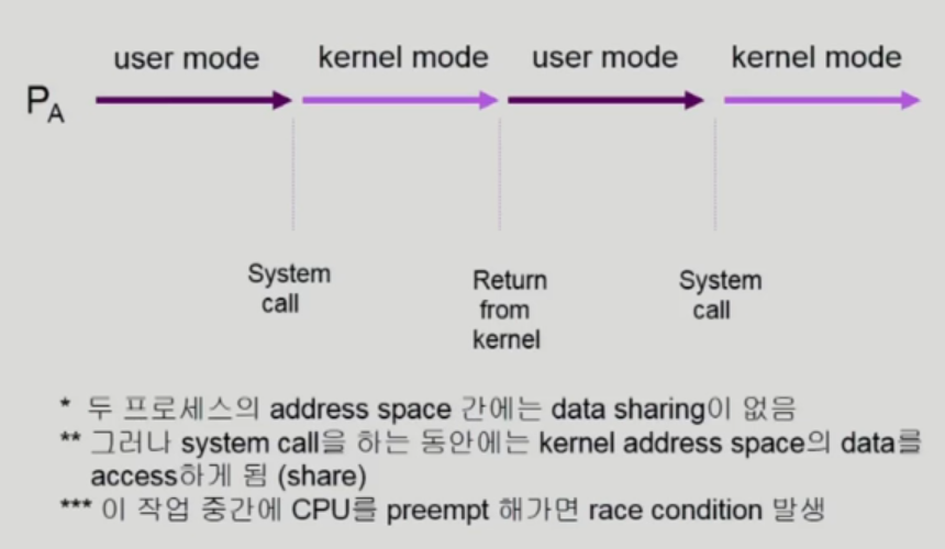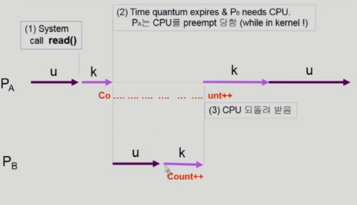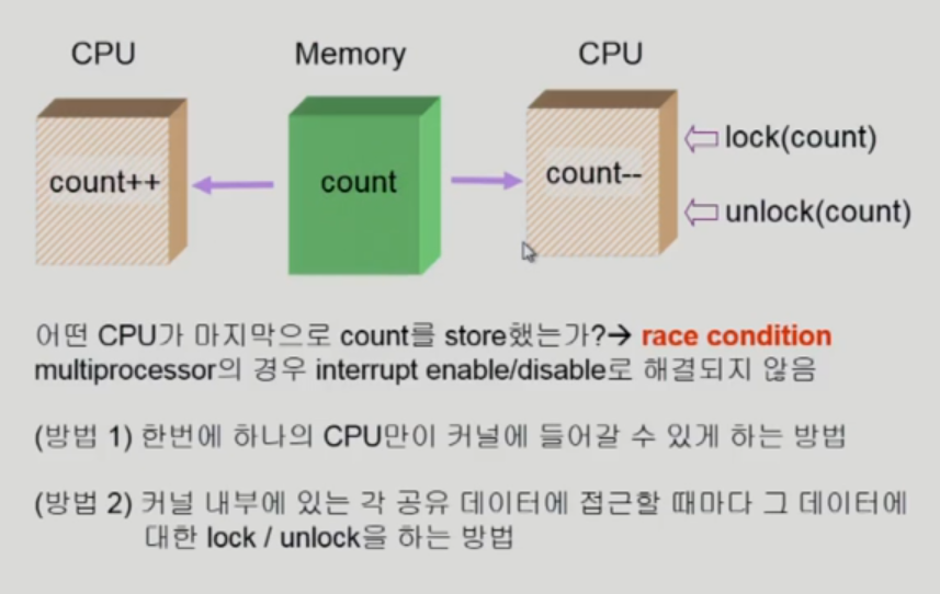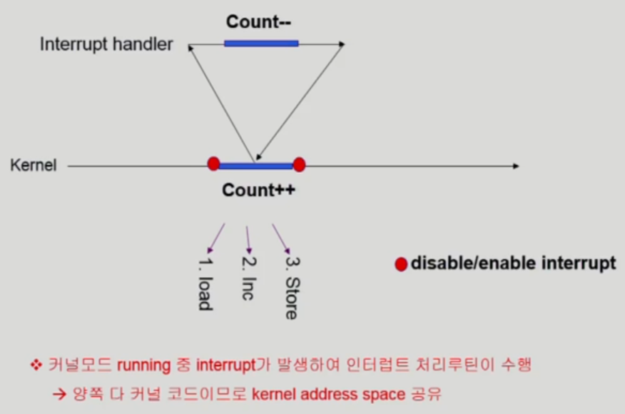 - 중요한 변수값을 kernel이 처리하는 경우 interrupt 처리를 disable 시켜서 kernel이 수행하는 프로세스가 종료된 후 interrupt를 처리하는 방식으로 문제를 주로 해결함.