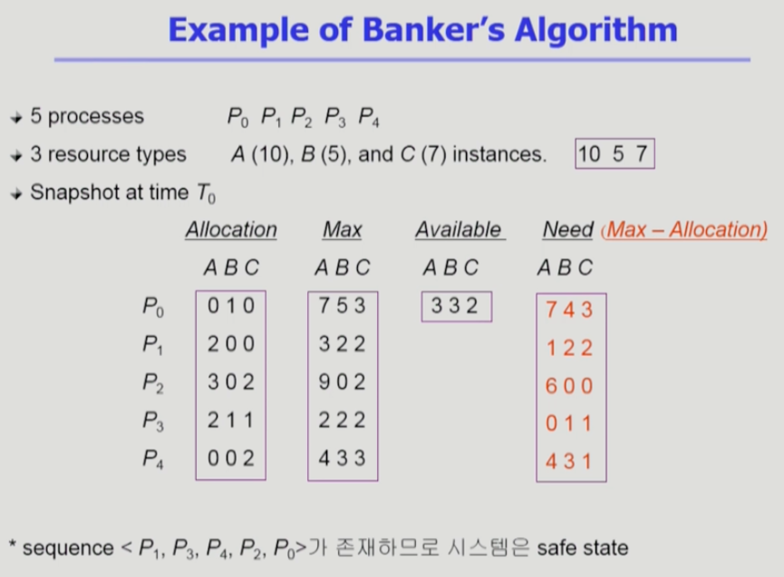 - 프로세스의 sequence <p1, p2, p3 … pn>이 safe하려면 Pi(1 <= i <= n)의 자원 요청이 가용 자원 + 모든 Pj(j < i)의 보유 자원 에 의해 충족되어야 함.