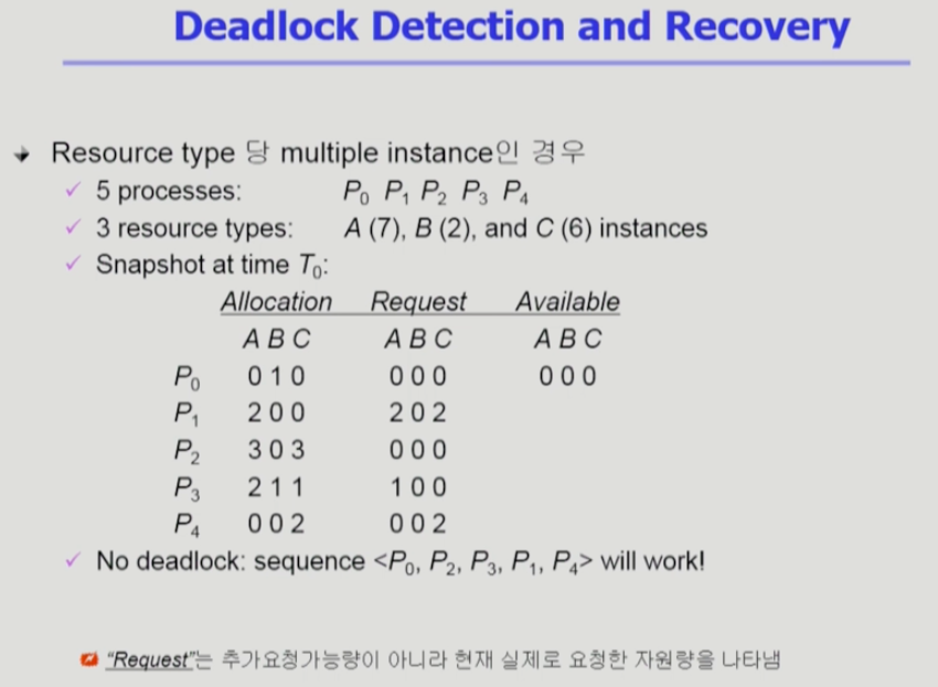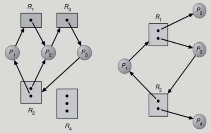 - 두번째 그림은 인스턴스가 여러개지만, cycle이 2개고 요청한 프로세스가 다 대기상태이므로 교착상태임. (남는 자원이나 반납할 수 있는 자원 존재 X)