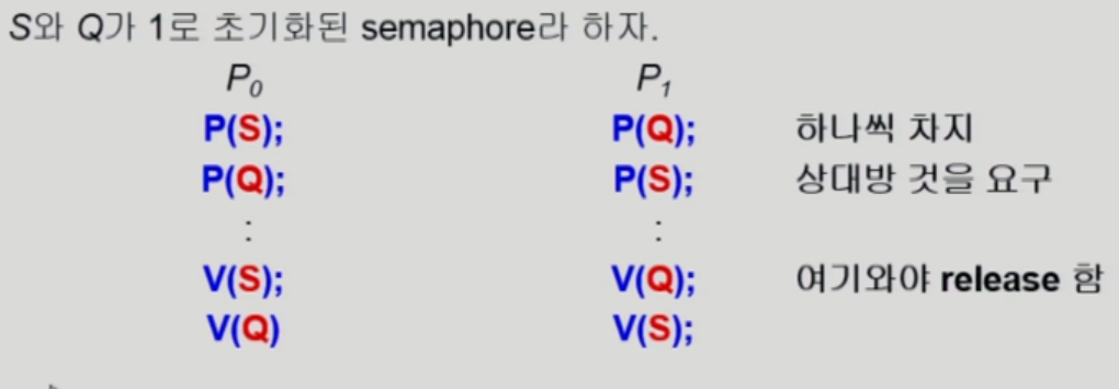 - indefinite blocking : 프로세스가 suspend 된 이유에 해당하는 세마포어 큐에서 빠져나갈 수 없는 현상