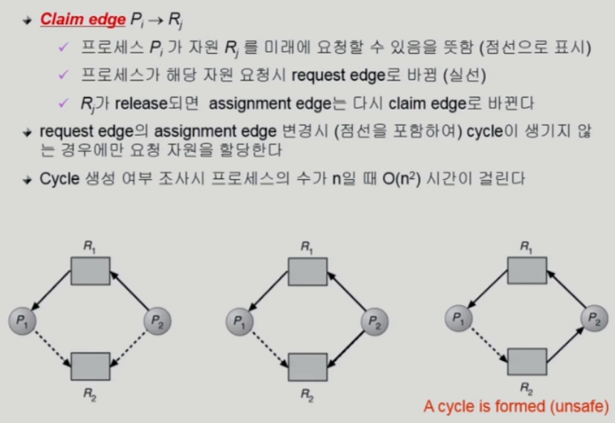 시스템 state가 원래 state로 돌아올 수 있는 경우에만 자원 할당 가장 단순하고 일반적인 모델은 프로세스들이 필요로 하는 각 자원별 최대 사용량을 미리 선언하도록 하는 방법임.