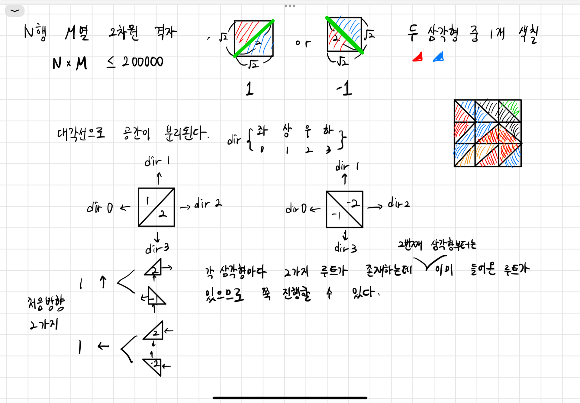 대각선에 상태가 1과 -1이 있고, 각 칸마다 2개의 삼각형으로 나뉜다. 이때 대각선 1에 의해 나뉜 삼각형을 왼쪽부터 1과 2, 대각선 -1에 의해 나뉜 삼각형을 왼쪽부터 -1, -2로 설정했다. 이후 각 삼각형마다 어떤 방향으로 갈 수 있는지 살펴보면
