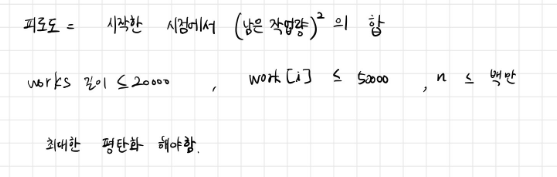 회사원 Demi는 가끔은 야근을 하는데요, 야근을 하면 야근 피로도가 쌓입니다. 야근 피로도는 야근을 시작한 시점에서 남은 일의 작업량을 제곱하여 더한 값입니다. Demi는 N시간 동안 야근 피로도를 최소화하도록 일할 겁니다.Demi가 1시간 동안 작업량 1만큼을 처리할 수 있다고 할 때, 퇴근까지 남은 N 시간과 각 일에 대한 작업량 works에 대해 야근 피로도를 최소화한 값을 리턴하는 함수 solution을 완성해주세요.