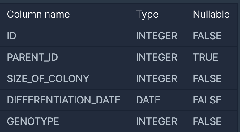 | ID | PARENT_ID | SIZE_OF_COLONY | DIFFERENTIATION_DATE | GENOTYPE |