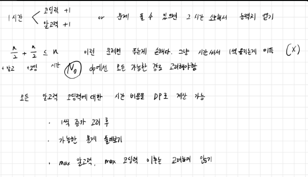 알고력과코딩력을 높입니다. 각 문제마다 문제를 풀면 올라가는 알고력과 코딩력이 정해져 있습니다. - 문제를 하나 푸는 데는 문제가 요구하는 시간이 필요하며 같은 문제를 여러 번 푸는 것이 가능합니다.