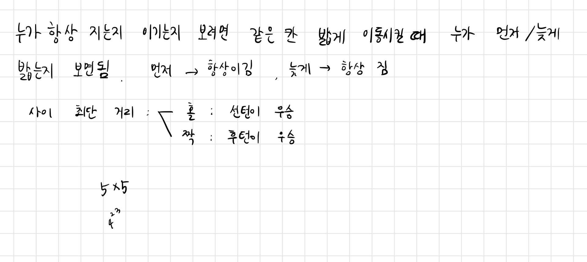 - dfs 반환 이동 횟수가 홀수: 다음 플레이어 이후에 현재 플레이어가 움직일 수 없음 → 현재 플레이어 패배