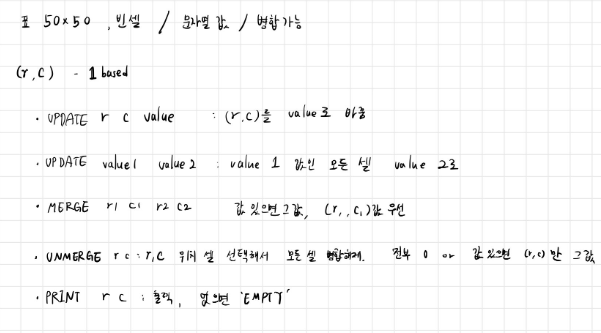 commands의 길이 ≤ 1,000 commands의 각 원소는 아래 5가지 형태 중 하나입니다."UPDATE r c value"r,c는 선택할 셀의 위치를 나타내며, 1~50 사이의 정수입니다.value는 셀에 입력할 내용을 나타내며, 알파벳 소문자와 숫자로 구성된 길이 1~10 사이인 문자열입니다.