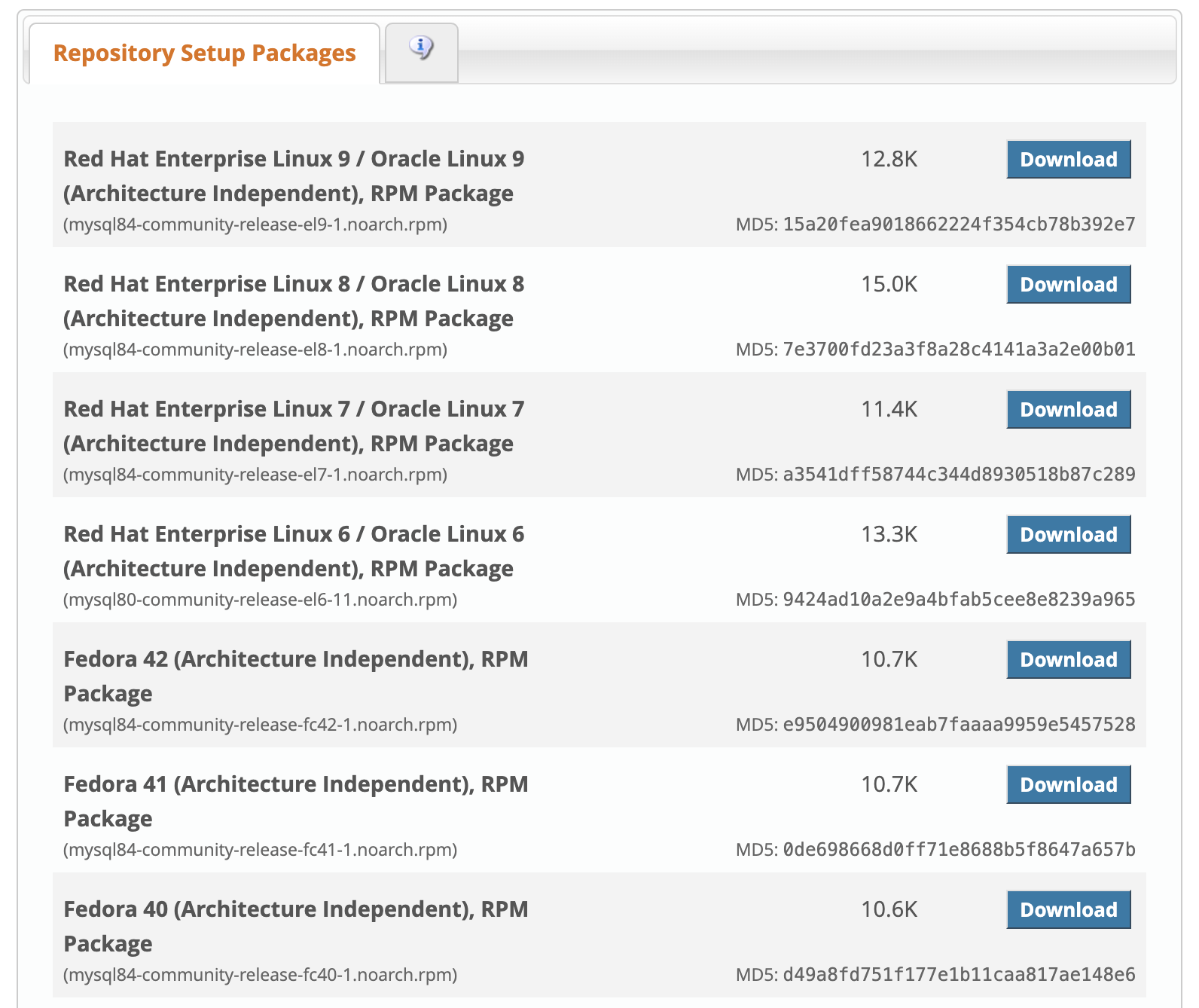 Yum 인스톨러 없이 RPM 패키지로 직접 설치하려면 필요한 RPM 패키지를 수동으로 직접 다운로드해야 한다. MySQL RPM 다운로드 페이지 에서 운영체제의 버전과 CPU 아키텍처를 선택한 후, 다운로드 하면 된다. 원하는 버전이 따로 있다면 선택도 가능하다.