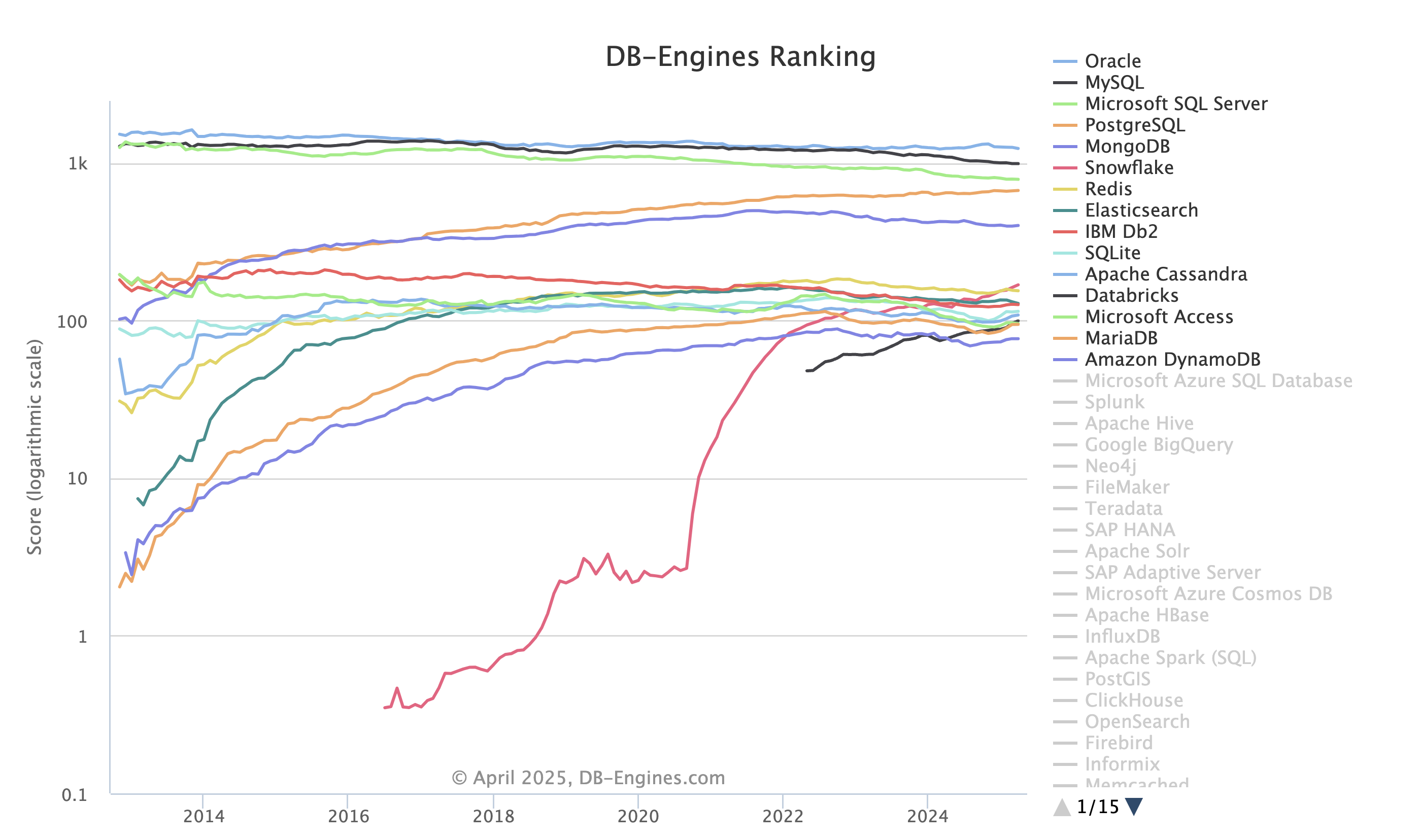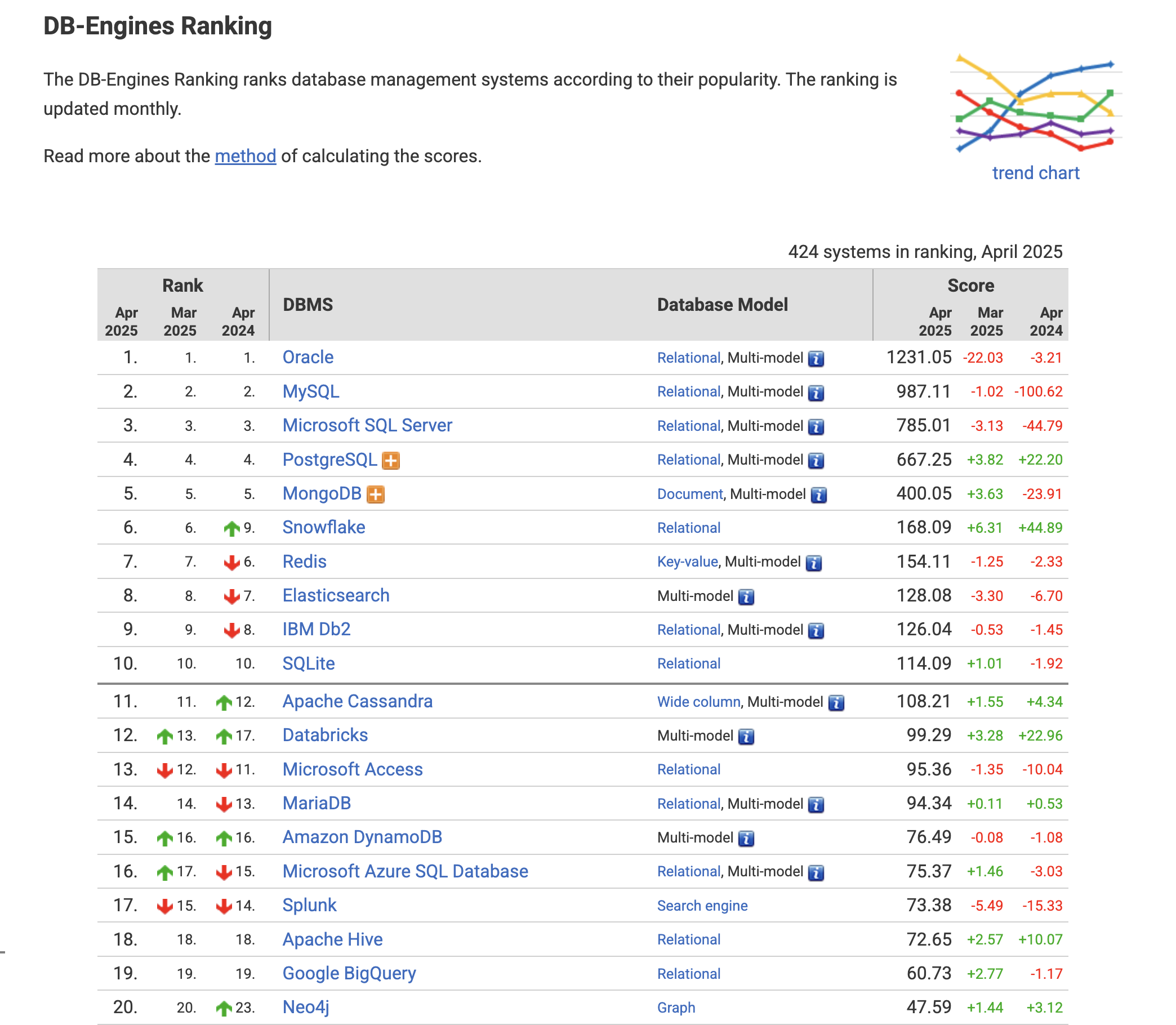 2025년 4월, 424개 DBMS 시스템 중 상위 20개