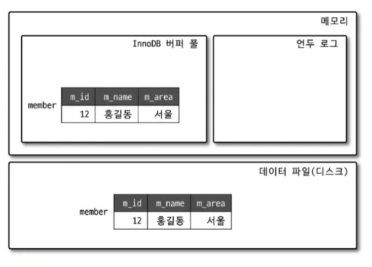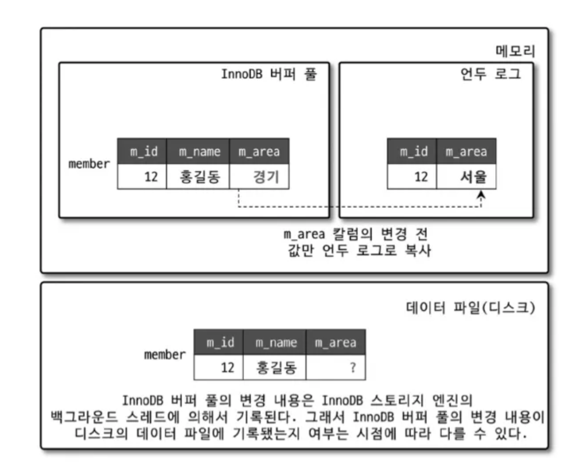 - 데이터가 변경되면 InnoDB는 변경 내용을 리두 로그에 기록하고 버퍼 풀의 데이터 페이지에 반영(보장 X)
