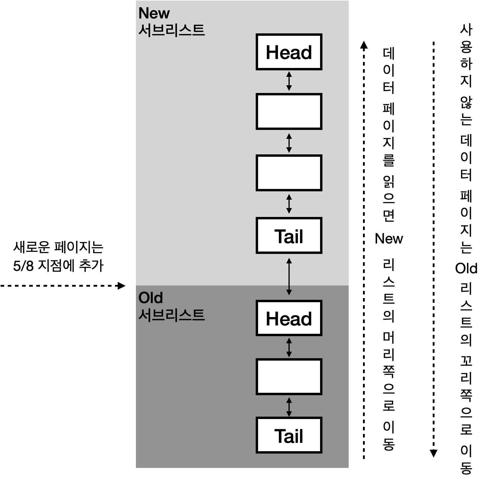 자주 사용되면 MRU에 계속 있고, 아니면 LRU의 끝으로 밀려나서 InnoDB버퍼풀에서 제거