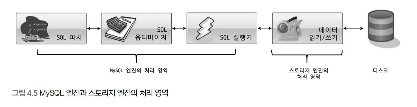 하나의 쿼리 작업은 여러 하위 작업으로 나뉘는데, 각 하위 작업이 MySQL 엔진 영역에서 처리되는지 아니면 스토리지 엔진 영역에서 처리되는지 구분할 줄 알아야 한다.