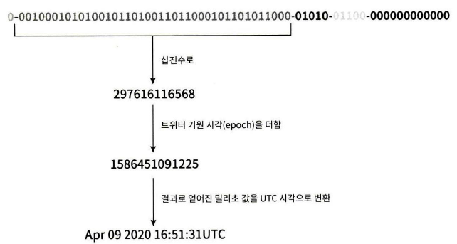 타임스탬프(timestamp): 41비트를 할당한다. 기원 시각(epoch) 이후 몇 밀리초가 경과했는지를 나타내는 값이다. 트위터 스노플레이크 구현에서 사용하는 값은 1288834974657