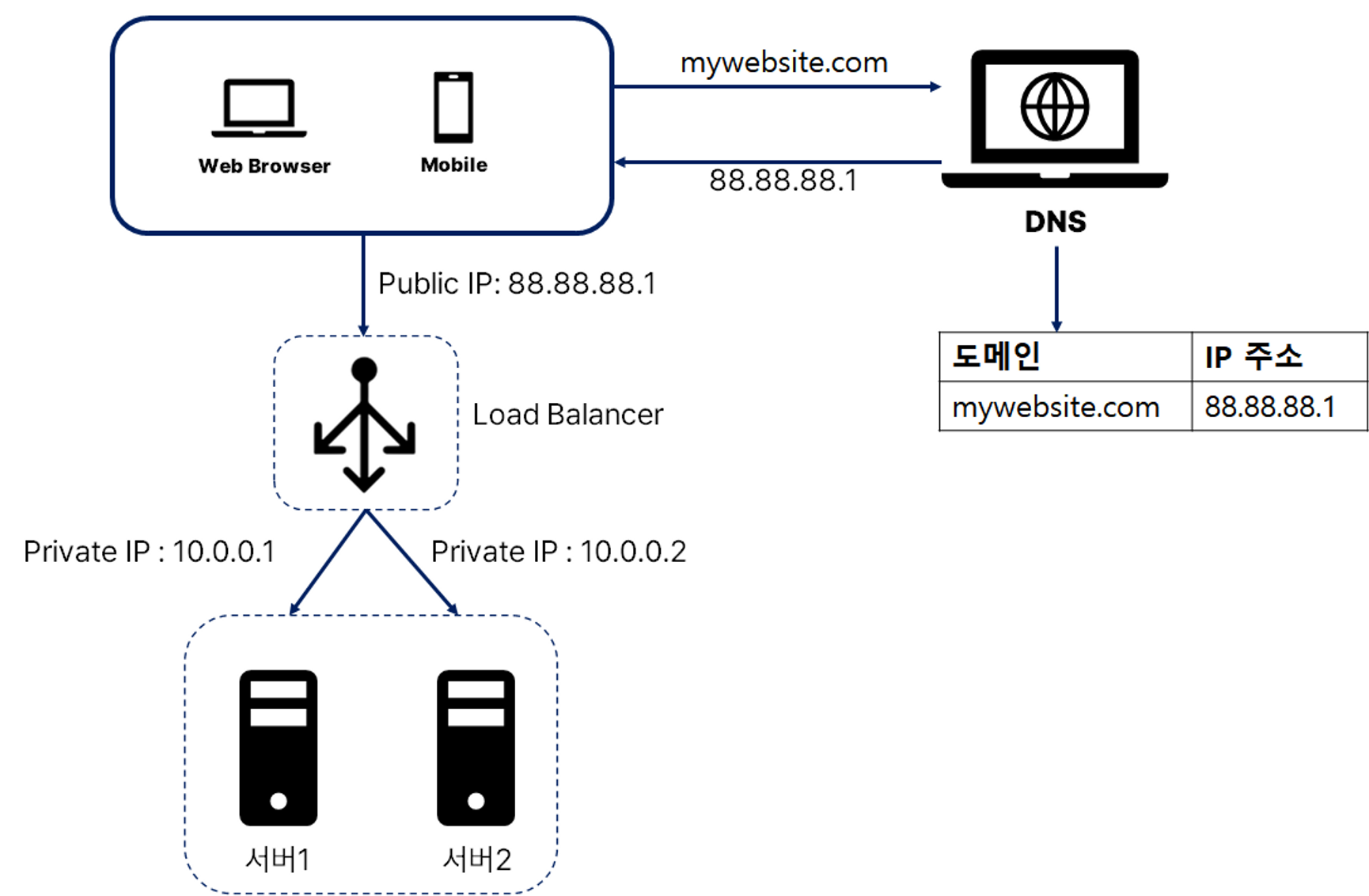- DNS로 부터 로드밸런서의 public IP address 조회