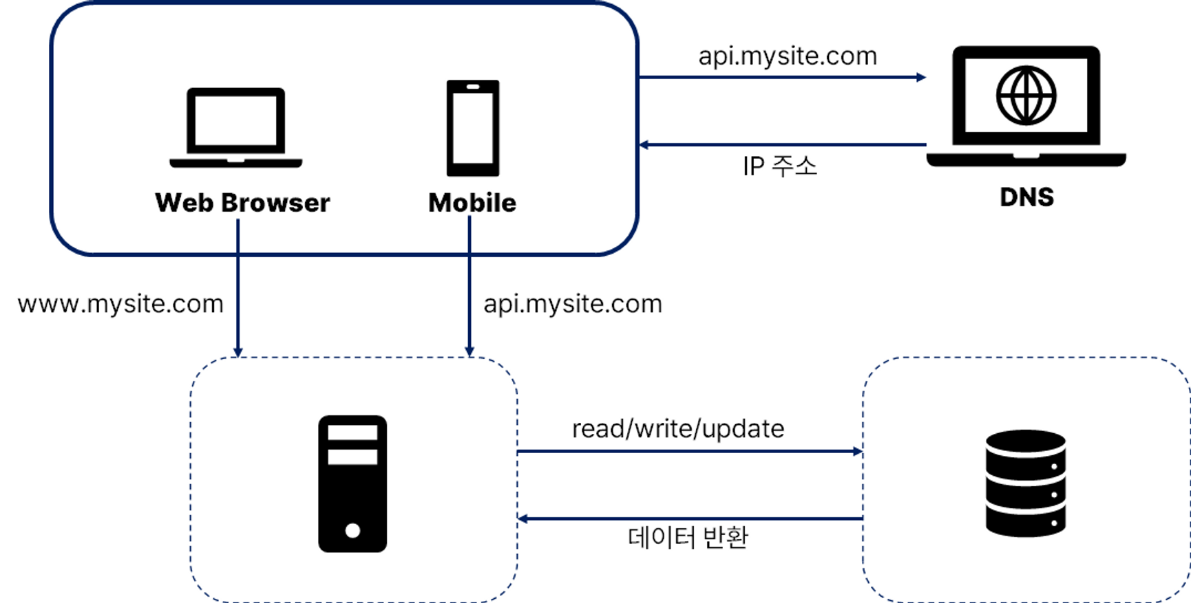 - 웹 서버는 필요한 작업에 맞는 데이터 베이스로 조회 혹은 추가, 삭제, 갱신 연산을 수행