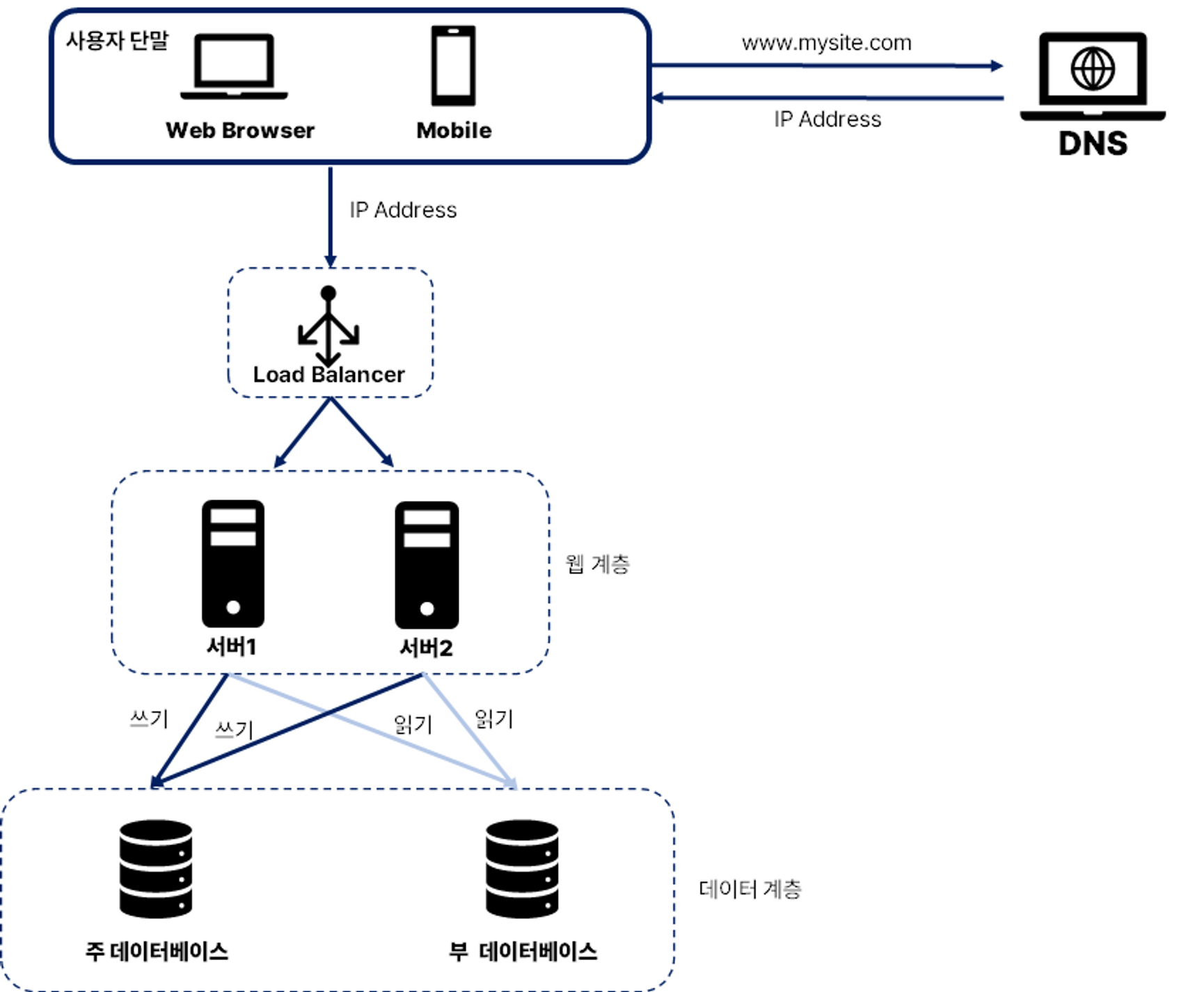 위 그림은 로드밸런서와 데이터베이스 다중화를 고려한 설계안이다.