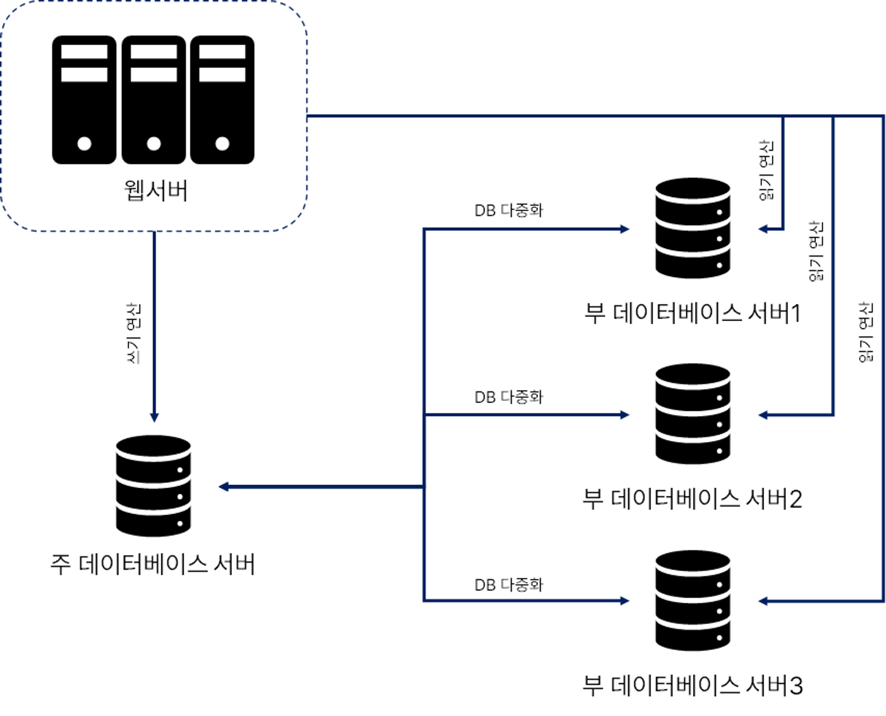 서버 사이에 주(master, primary)-부(slave, secondary) 관계를 설정 하고 데이터 원본은 주 서버에서, 사본은 부 서버에 저장하는 방식이다.