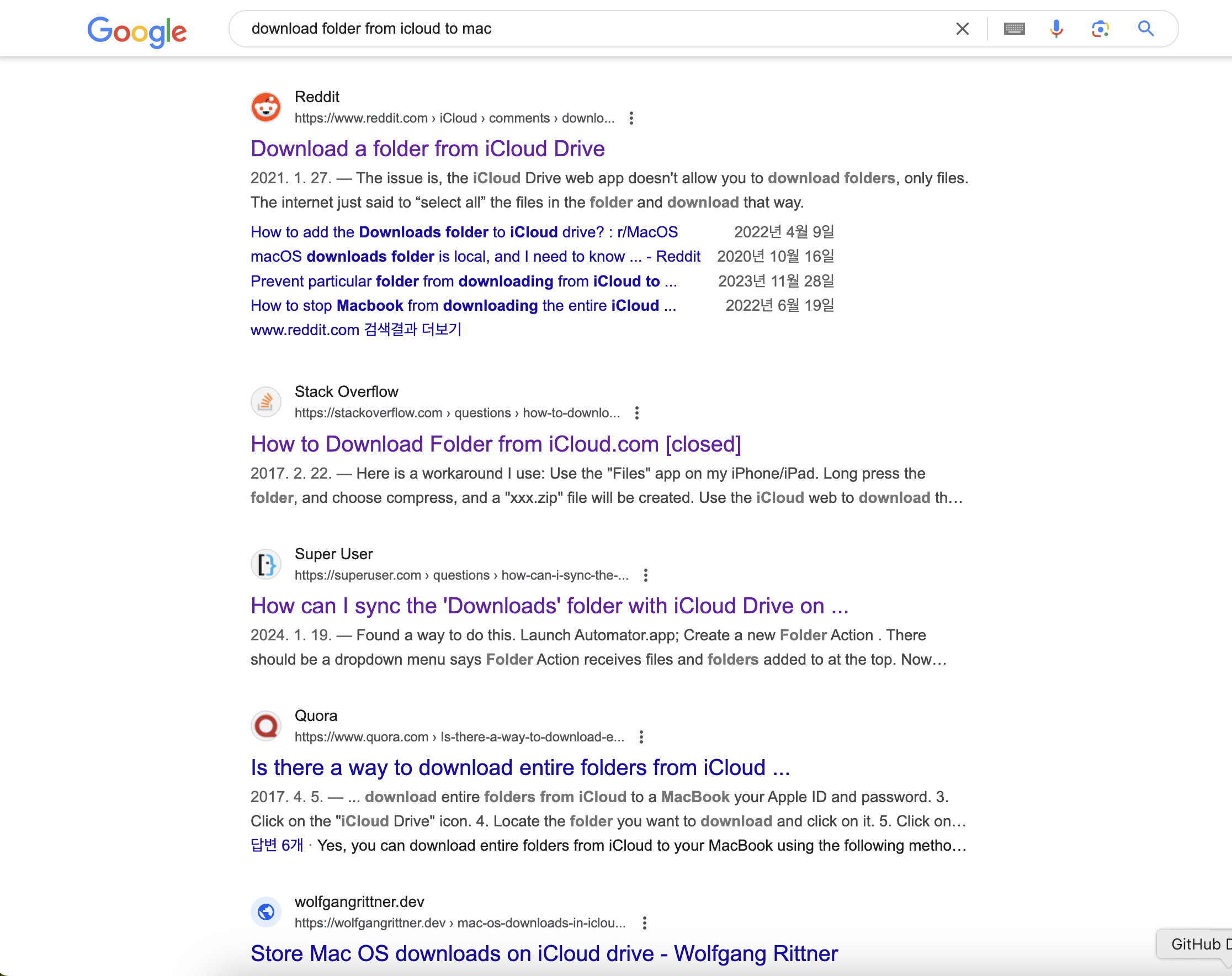 - iCloud에 남아있는 파일들을 로컬로 다운받기. -> 가능은 하다. 문제는 폴더 다운로드가 안된다는 것. 진짜 치명적인 단점이다. 개발자들의 경우 프로젝트 파일에만 수십개의 폴더가 있고 파일은 수백개이며 assets등을 포함하면 용량도 작지 않다. 이런 작업물들을 어떻게 파일 단위로 하나하나 다운받고 다시 정리하겠는가?